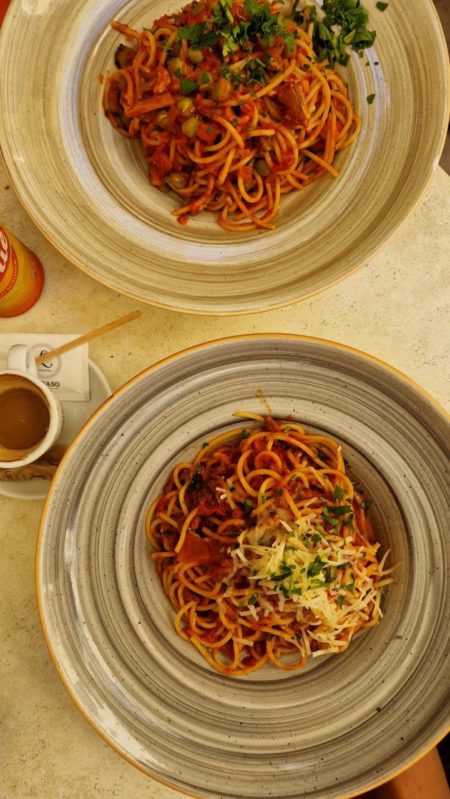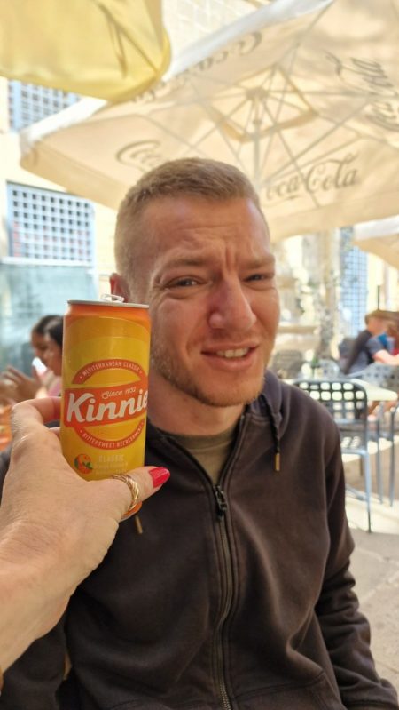Obilazimo neke od glavnih znamenitosti grada i teškom mukom odabiremo i sjedamo u jedan od mnogih restorana (Luciano) duž glavne ulice. Irma uzima pizzu s gljivama (10.50 eura), Nino uzima bq rebarca (23.50 eura), Dominik špagete bolonjez (12 eura), Tina dagnje s češnjakom (14.5 eura),a ja uzimam špagete s zečetinom (14.5 eura). Za piće nam stiže espresso (2.20 eura), krigla blue label pive (5.60 eura) i ja biram Kinnie (2.30 eura), malteško bezalkoholno, gazirano piće od gorke naranče i ekstrakta pelina. Iako mi je bilo odvratno, Kinnie je omiljeno bezalkoholno piće na Malti, jedinstvenog gorko-slatkog okusa. Pije se s kriškom naranče i puno leda, a sastojak je i više koktela. Svoj „savršeni“ okus duguje mješavini malteških gorkih naranči i kombinaciji desetak aromatičnih biljaka i začina kao što su anis, ginseng, vanilija, rabarbara i sladić. U odnosu na većinu drugih bezalkoholnih pića navodno se u recepturi koriste samo prirodni sastojci, a ns tržištu je od 1952. godine! Sveukupno 85.10 eura! Ne znam je li do Kinnie-a, ali niti taj zec mi nije sjeo! Idemo dalje!