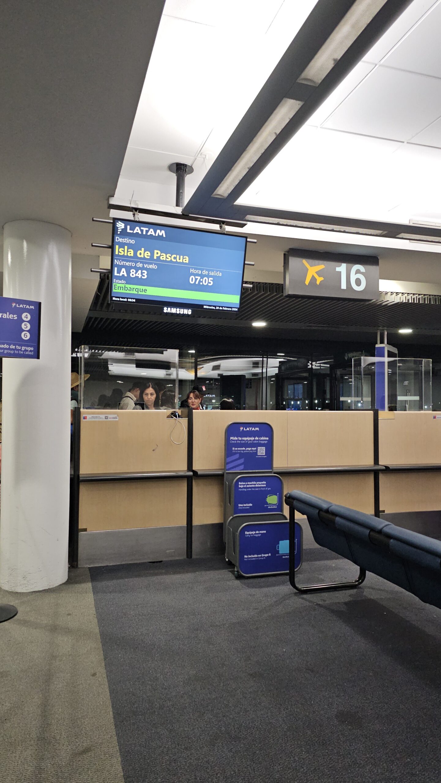 Na Latamov šalter, s natpisom „Isla de Pascua“, što na Španjolskom znači „Uskršnji otok“ stižemo točno u šest ujutro, sat vremena prije leta. Moja prtljaga za par kila prekoračuje limit pa se uspijevam izvući na to da su mi unutra medicinske potrepštine, što i nije daleko od istine, ali spašava me to penala od čak 60 dolara! Inače, Santiago je jedino mjesto iz kojeg se može letjeti za Uskršnji otok, a Latam jedina aviokompanija koja leti tamo. Letovi su dva puta dnevno, a cijene karata znaju ići i do 800 dolara.