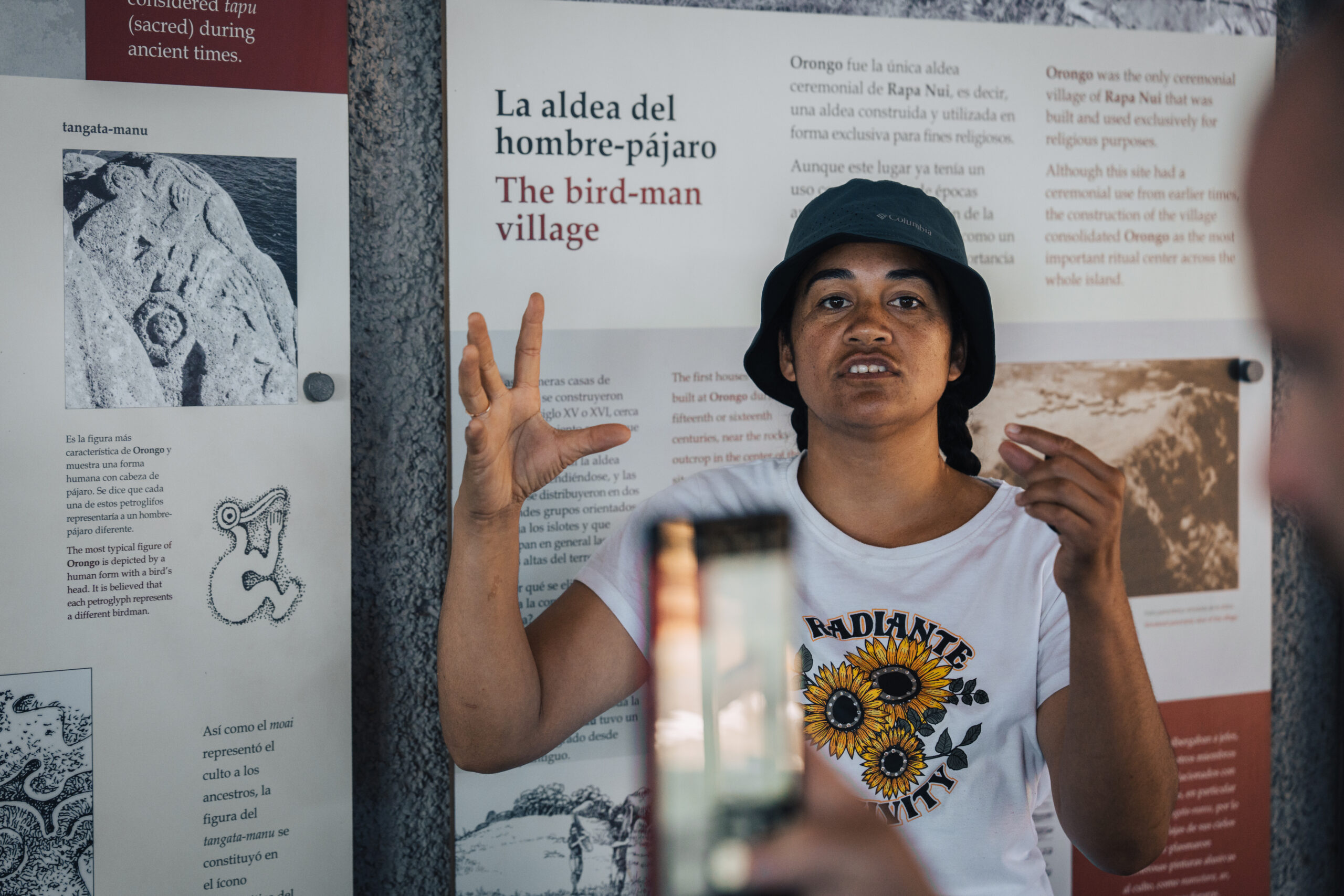 Vrativši se put parkinga, na svega par metara od auta nalazi se visitor’s centar. U njemu nam Jaque predstavlja petroglife, naselje Orongo i kult ptičjeg čovjeka, tzv. Tangata manu. Uskršnji otok ima jednu od najbogatijih zbirki petroglifa u cijeloj Polineziji, s oko 1.000 nalazišta i više od 4.000 katalogiziranih petroglifa. Motivi i slike urezivani su u kamen iz različitih razloga: za stvaranje totema, obilježavanje teritorija ili obilježavanje neke osobe ili događaja. Na otoku tako postoje izražene varijacije u učestalosti tema među petroglifima, s najvećom koncentracijom motiva „Ptičjeg čovjeka” (Birdman / Tangata manu) u Orongu, mjesta koje ćemo sljedeće posjetiti. Ostali motivi uključuju morske kornjače, Komari, znak plodnosti (vagine), Manu piri, povezanost muškarca i žene i Makemakea, glavnog Boga kulta Tangata manu ili „Ptičjeg čovjeka” s tijelom čovjek ali glavom i krilima ptice.