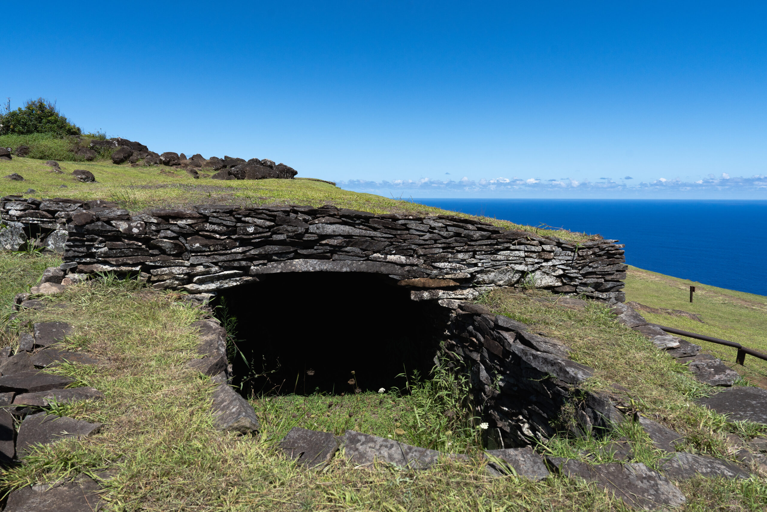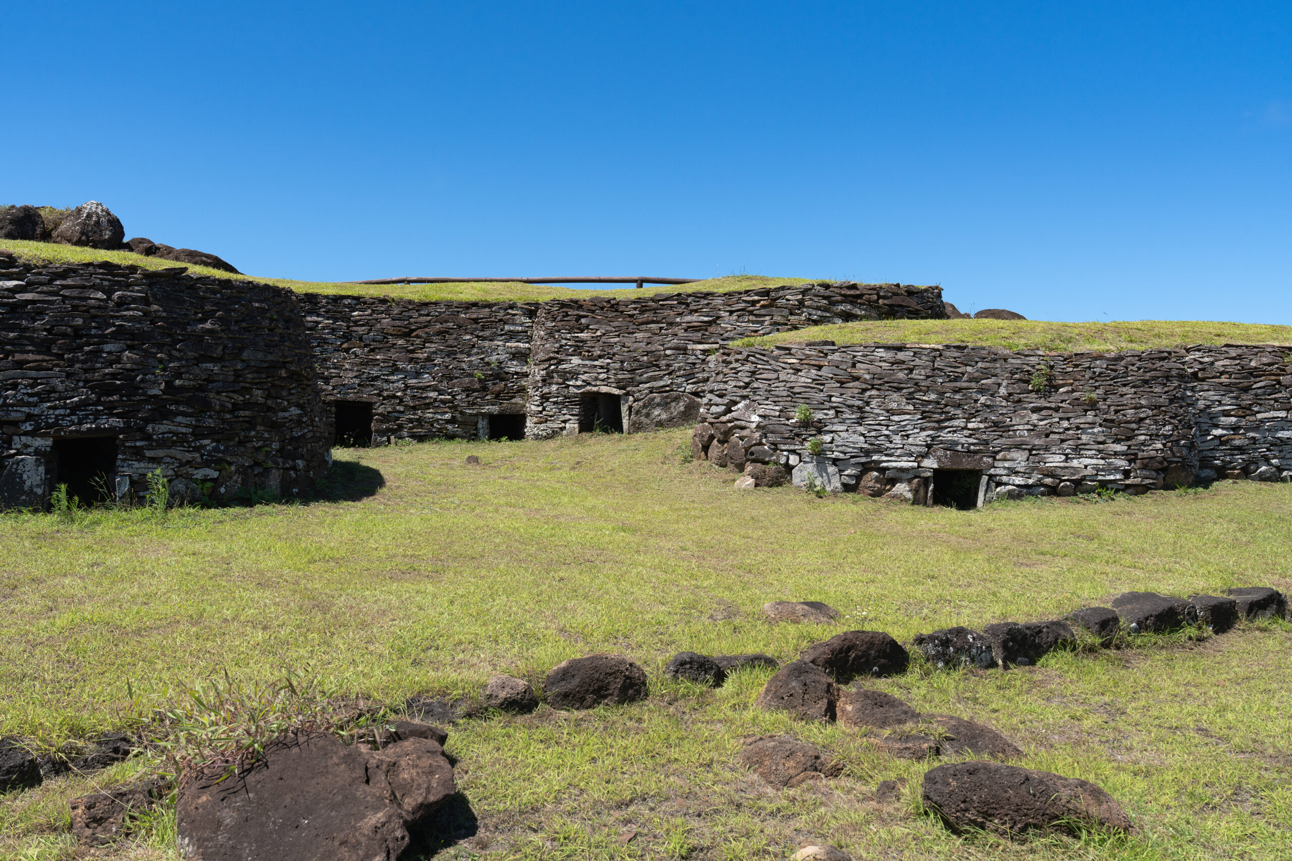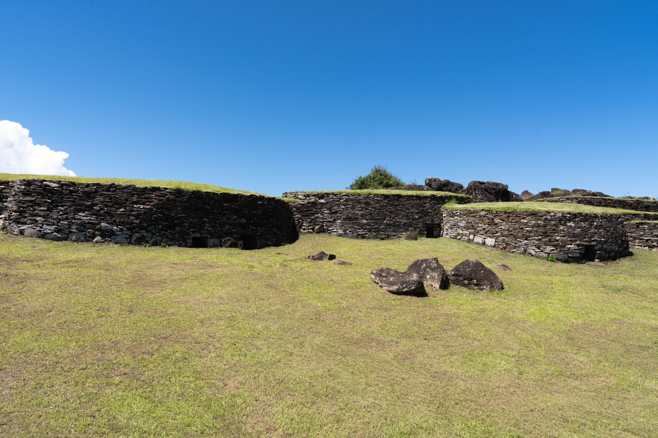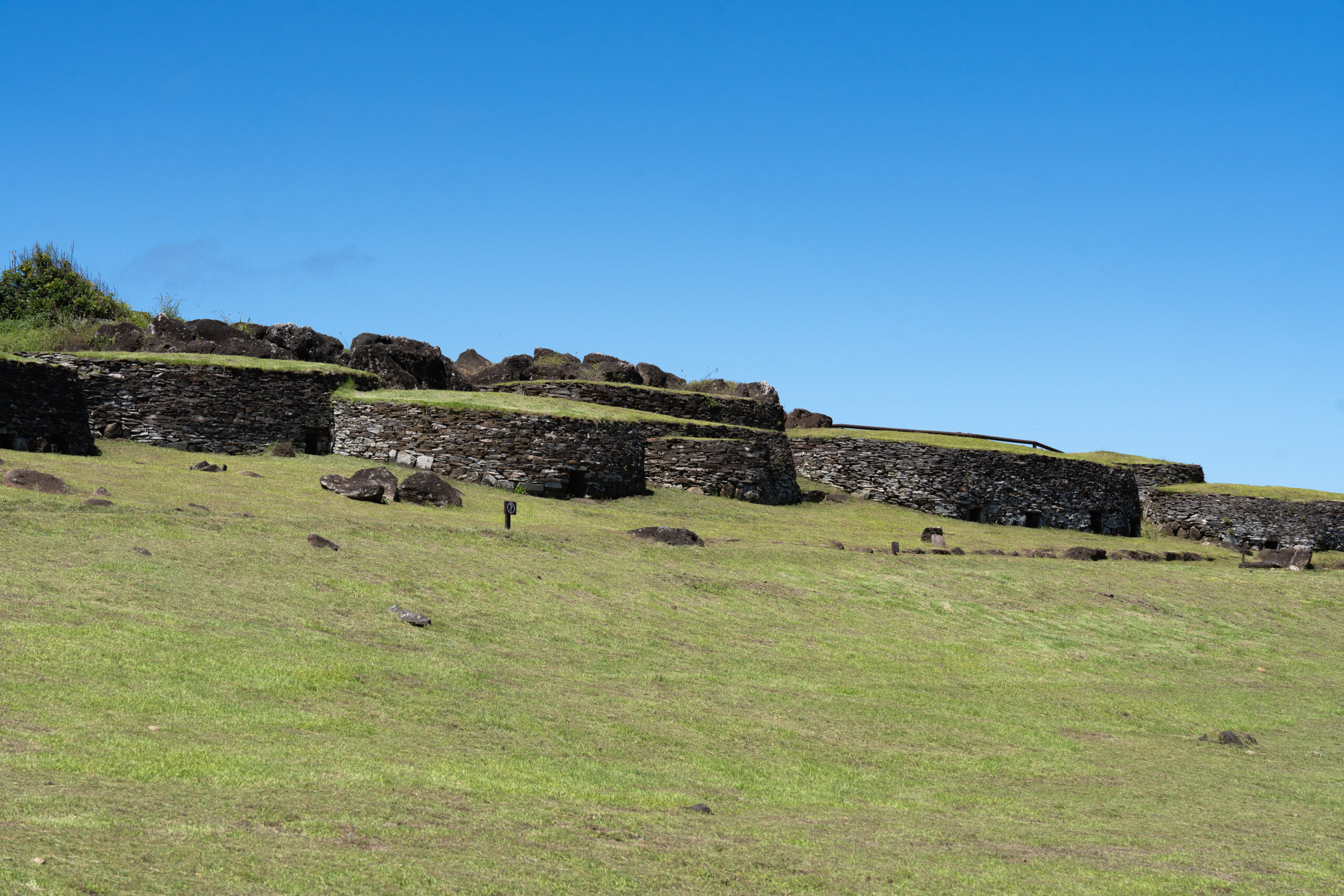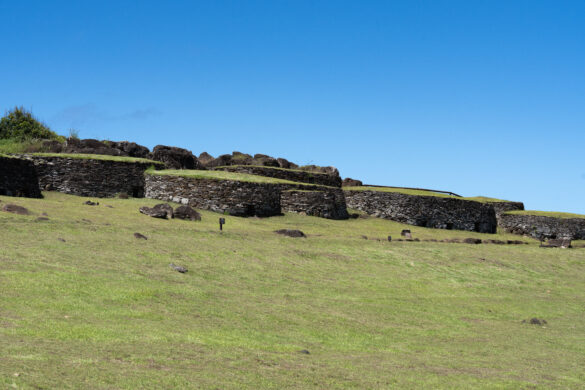 Nakon svega pet minuta hodanja stižemo do dobro očuvanih ruševina sela Orongo, također poznatog i kao „The bird man village“. Ovo selo bilo je jedino ceremonijalno selo izgrađeno od strane Rapa Nui koje je isključivo imalo religijsku svrhu i predstavljalo je najvažniji ritualni centar cijelog otoka. Osim toga, ono predstavlja jedinstvenu arhitektonsku prilagodbu. Ovdje je tradicionalni dizajn gradnje hare paenga preoblikovan i umjesto slamnatih krovova, kuće su bile potpuno izgrađene od ravnih ploča bazalta, koje su potjecale iz kratera Rano Kao. Ove kamene kuće, sagrađene oko 1400. godine, odražavaju odgovor na izloženost sela oštroj obalnoj klimi te korištenje bazalta kao dostupnog građevinskog materijala. Ulazi u nastambe bili su izrazito niski, pa su ljudi morali puzeći ulaziti unutra, značajka koja je vjerojatno pružala zaštitu od vremenskih nepogoda i time povećavala strukturnu stabilnost.