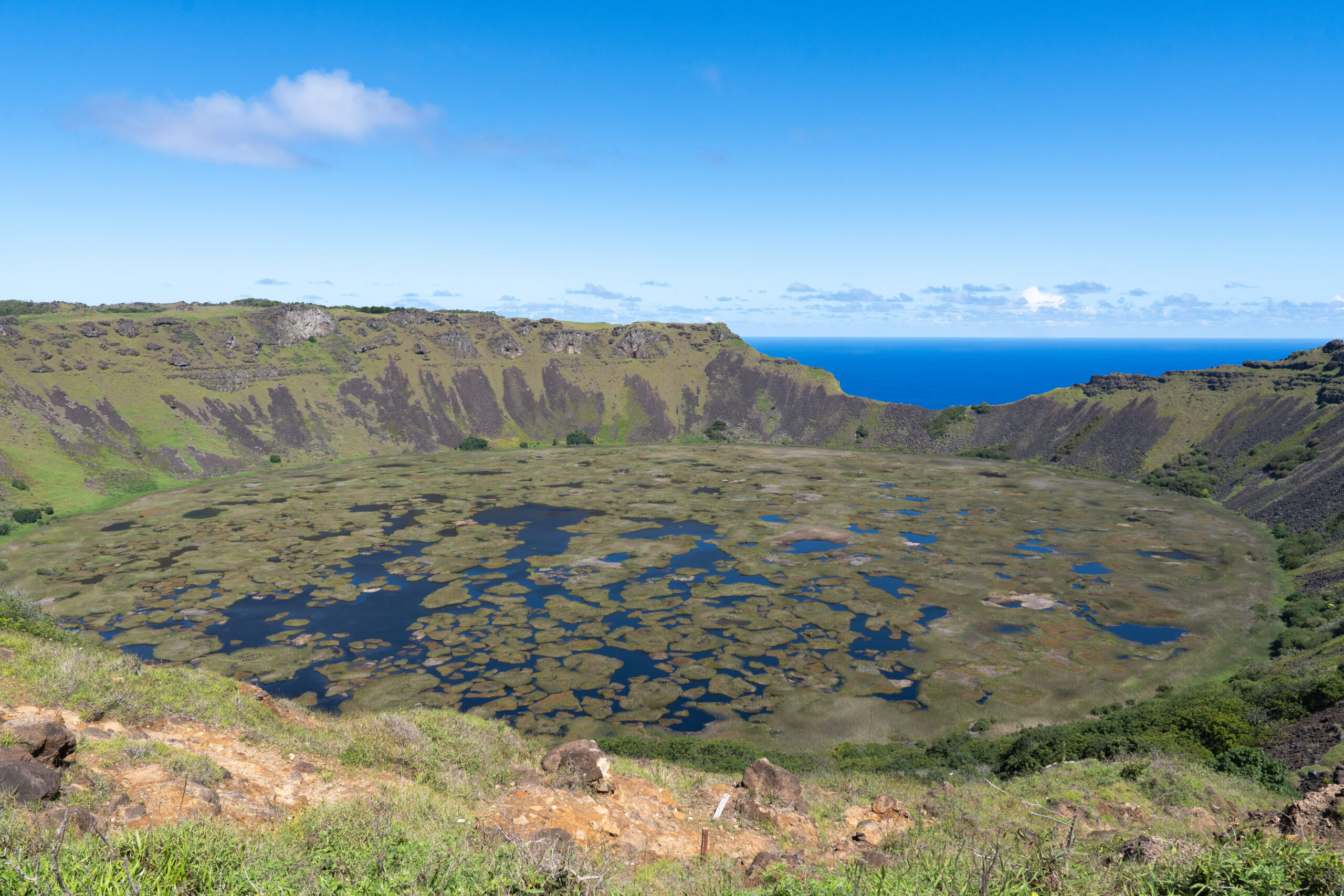 Dolaskom na parking na visini od 324 m izlazimo iz auta i dolazimo do litice nekadašnjeg vulkana Rano Kau. Impresivan pogled pruža se na cijelu kalderu, najveću na otoku, kao i na unutrašnje jezero koje je stanovnike otoka nekada opskrbljivalo pitkom vodom. Danas je jezero bitno za otok jer tu rastu endemične biljke kojih nema nigdje na otoku jer je krater zaštićen od utjecaja ljudi, životinja, vjetra i oceana i time stvara vlastitu mikroklimu. Osim vulkana Rano Kau, na otoku se nalazi cijeli niz istih, od kojih su najpoznatiji Poike, Kau-a, Rano Raraku, Rano kau, Rano Aroi i Teraveka koji je ujedno i najviši vrh otoka sa 511 m visine.