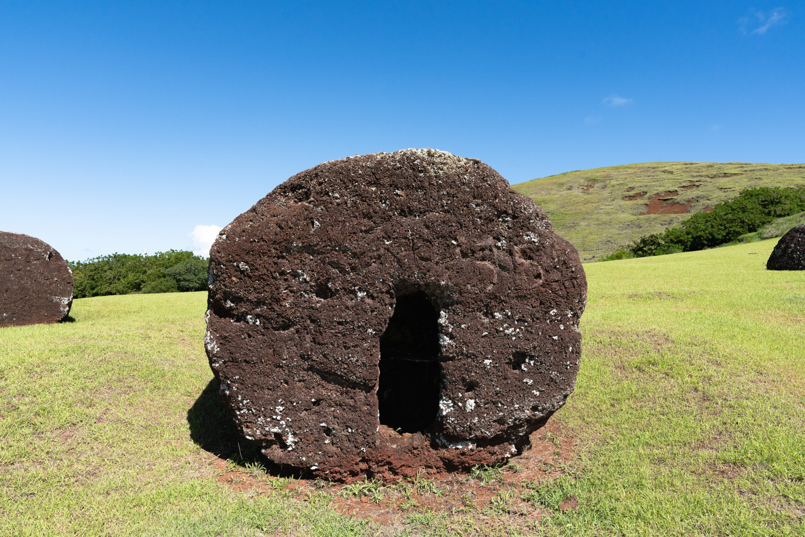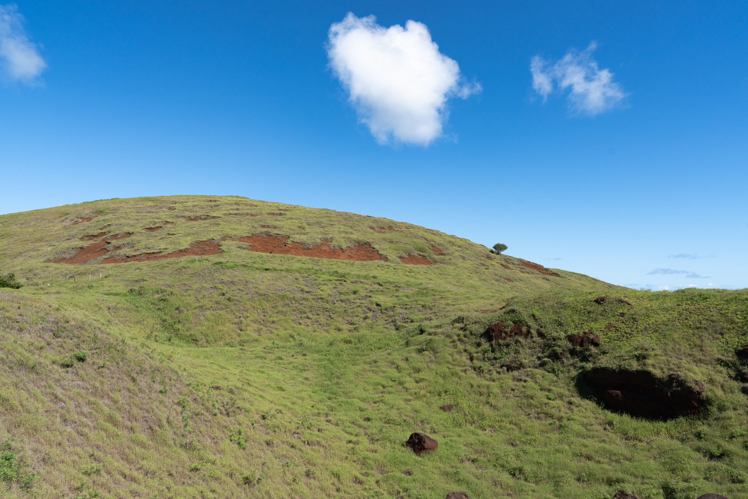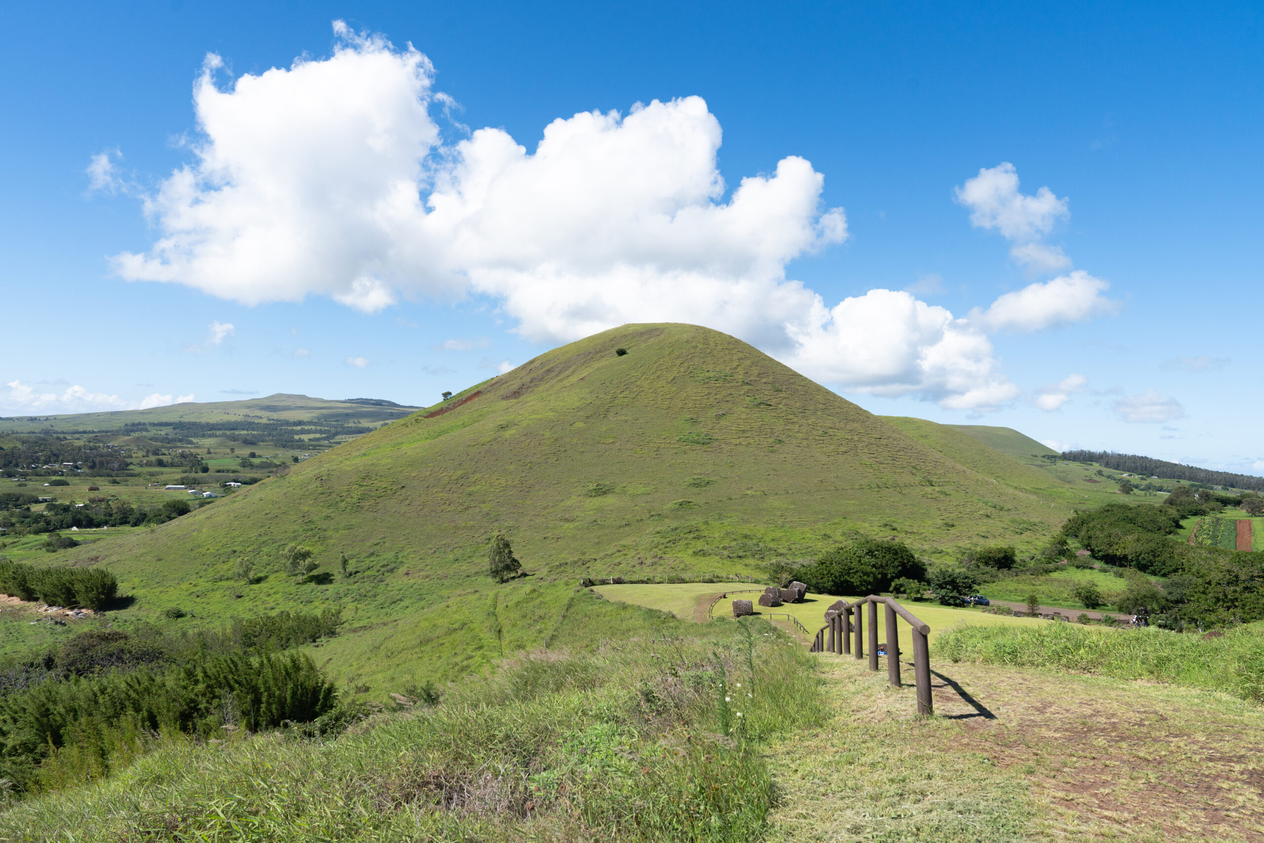 Došavši na vrh brda s lijeve strane primjećujem veliko i okruglo kamenje porazbacano po livadi. Upitavši Jaque o čemu se radi, uzimam joj riječ iz usta i nadovezujem se; „Jesu li to šeširi od moaia“? Kako nam Jaque govori, nalazimo se u Maunga Puna Pauu, malenom vulkanskom krateru ili „cono de ceniza“ (čunj od vulkanskog pepela) koji je nekoć služio kao prapovijesni kamenolom za klesanje tih šešira.