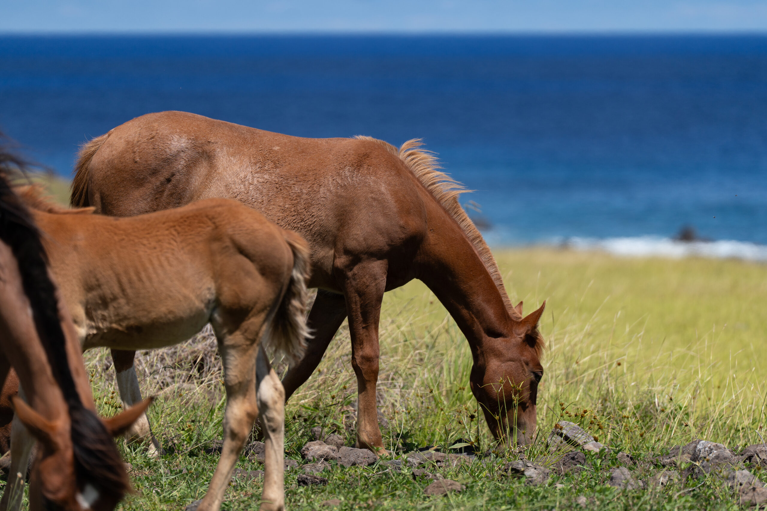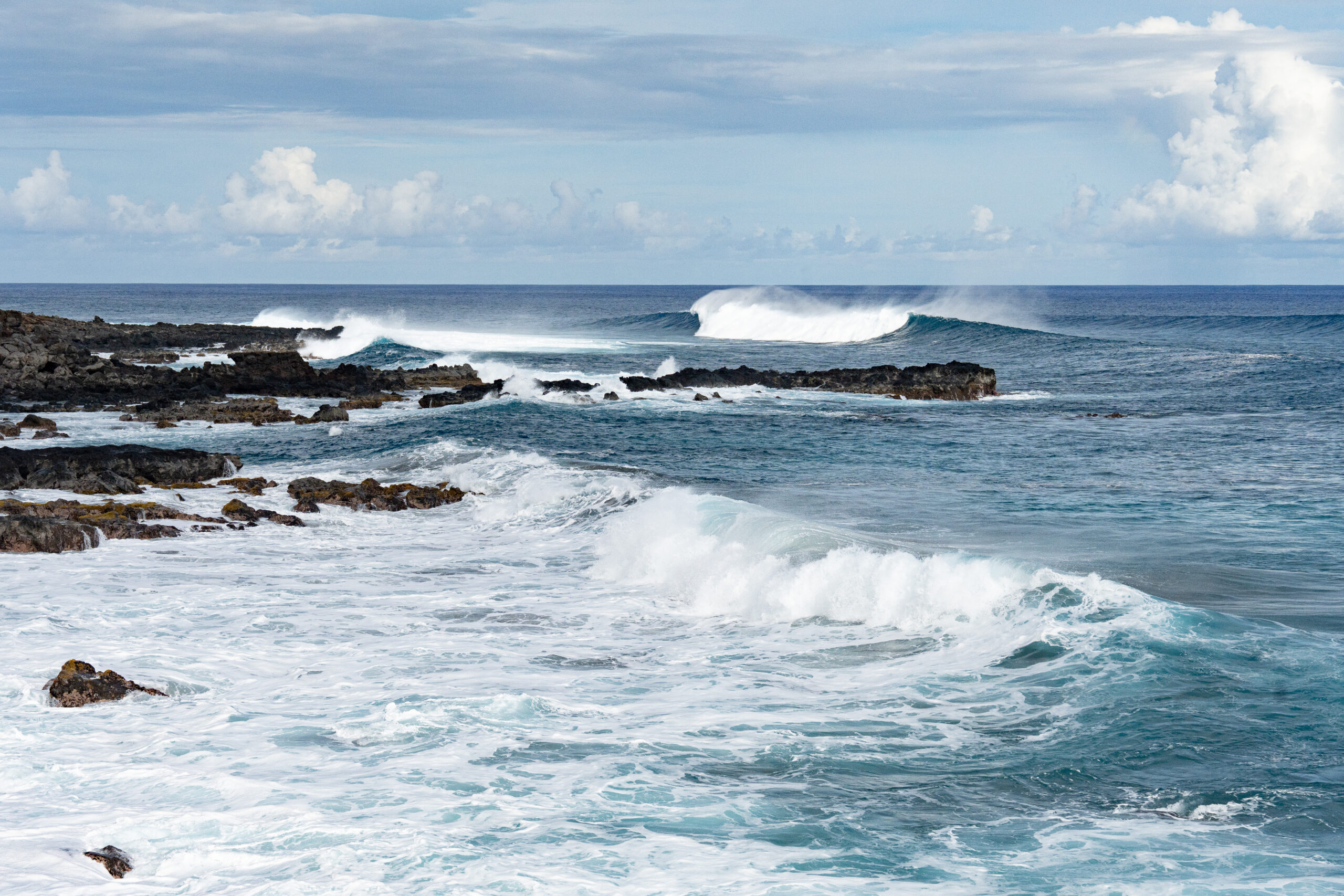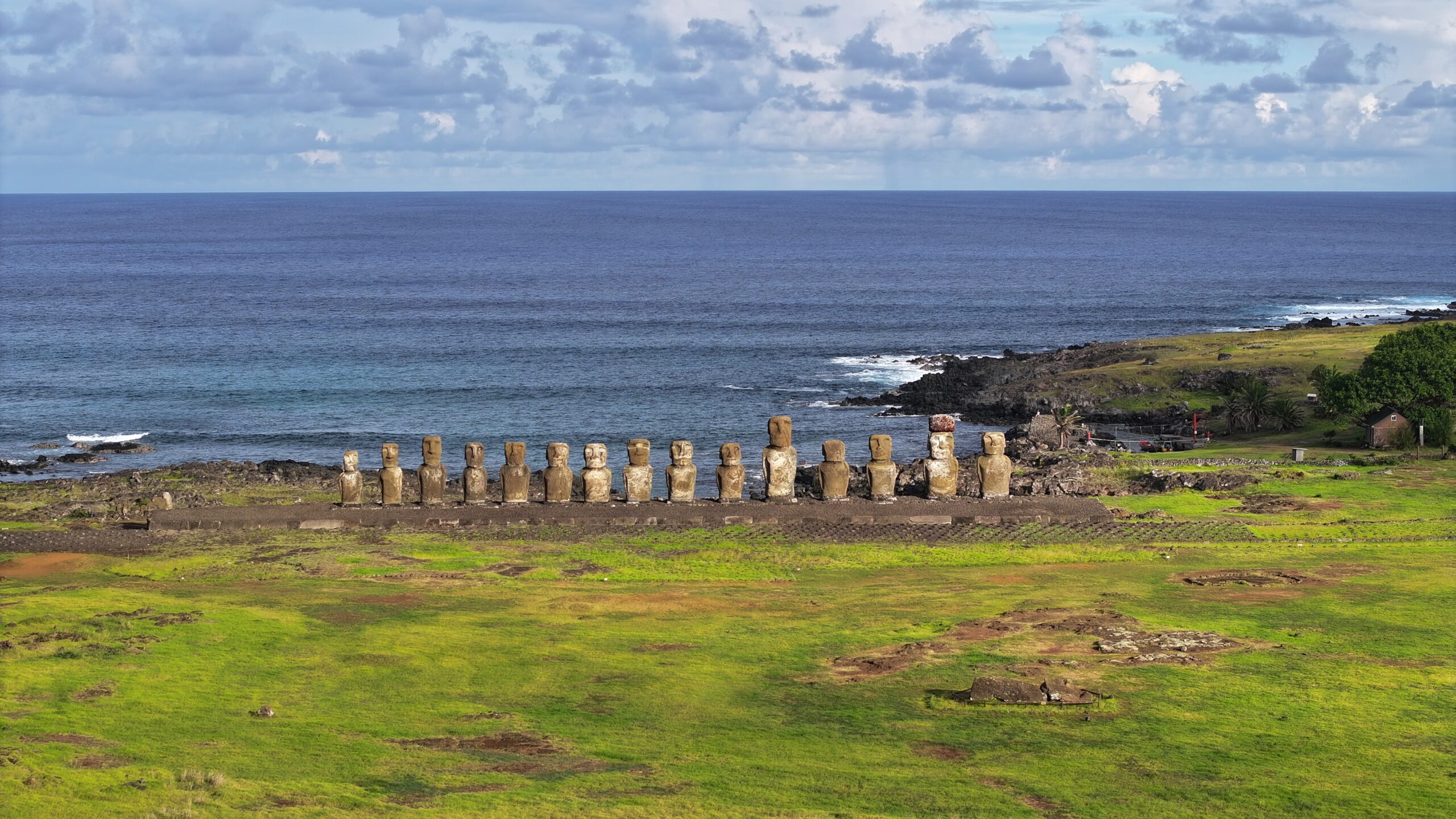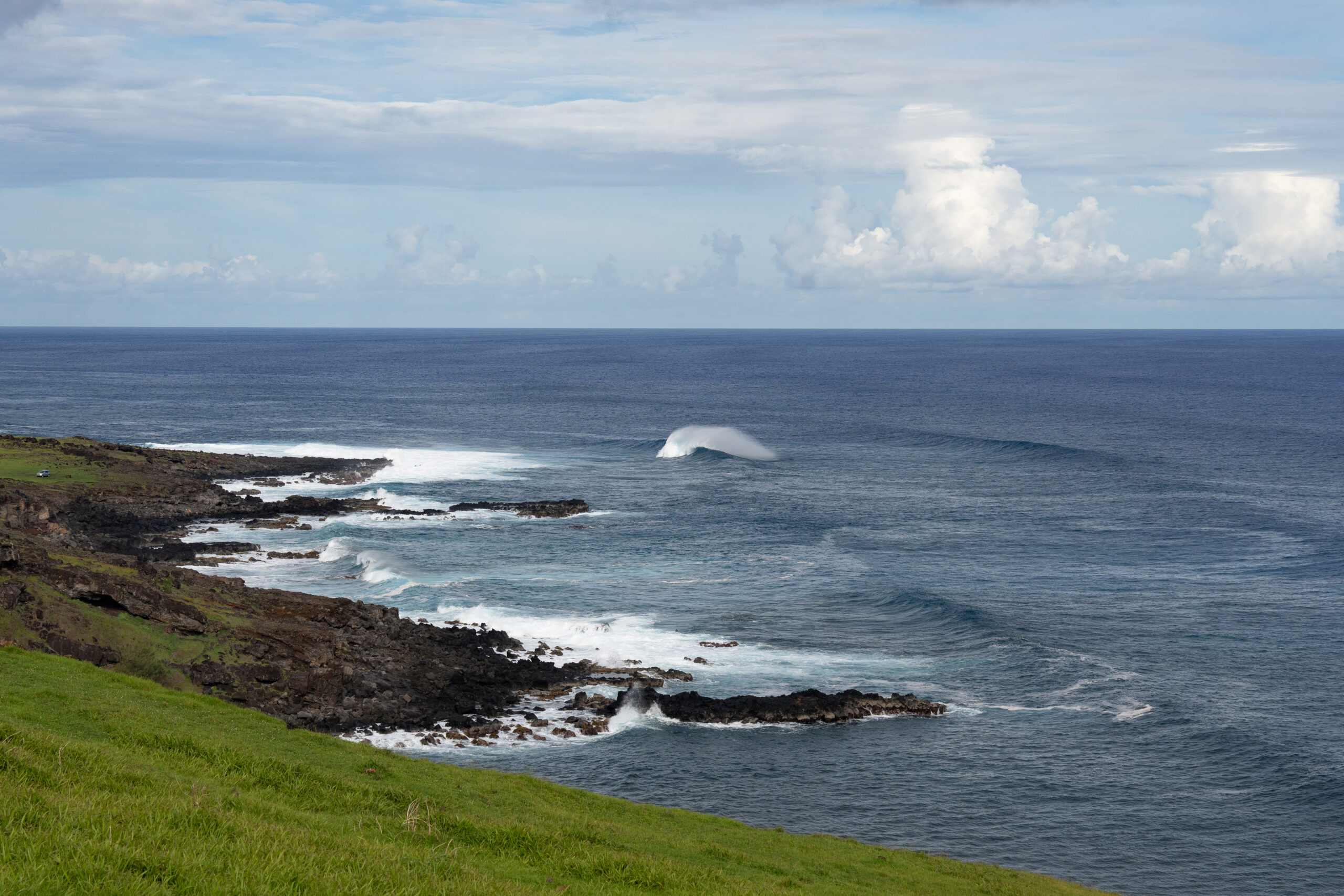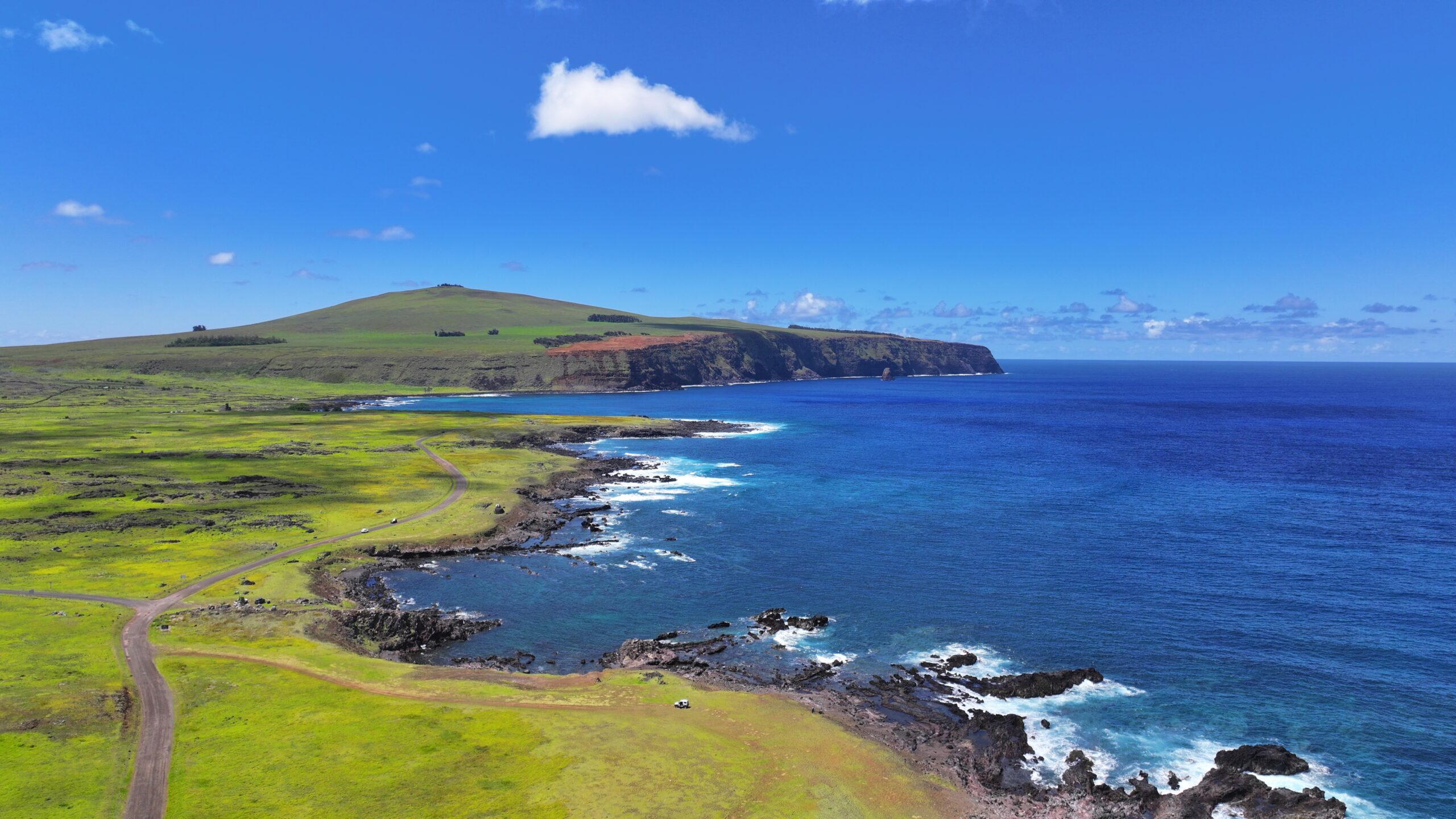 Vozimo se obalom i stajemo kako bi uživali u pogledu i velikim valovima koji se formiraju jedan iza drugoga. Ovdje se nalazimo u dilemi. Da li otići bliže Rano Rarakuu i riskirati ili dron podići odavde? Srečom, dron ima 7x digitalni zoom pa kipove uspijevamo snimiti sa preko 200 m udaljenosti, bez da dron itko primjećuje.
