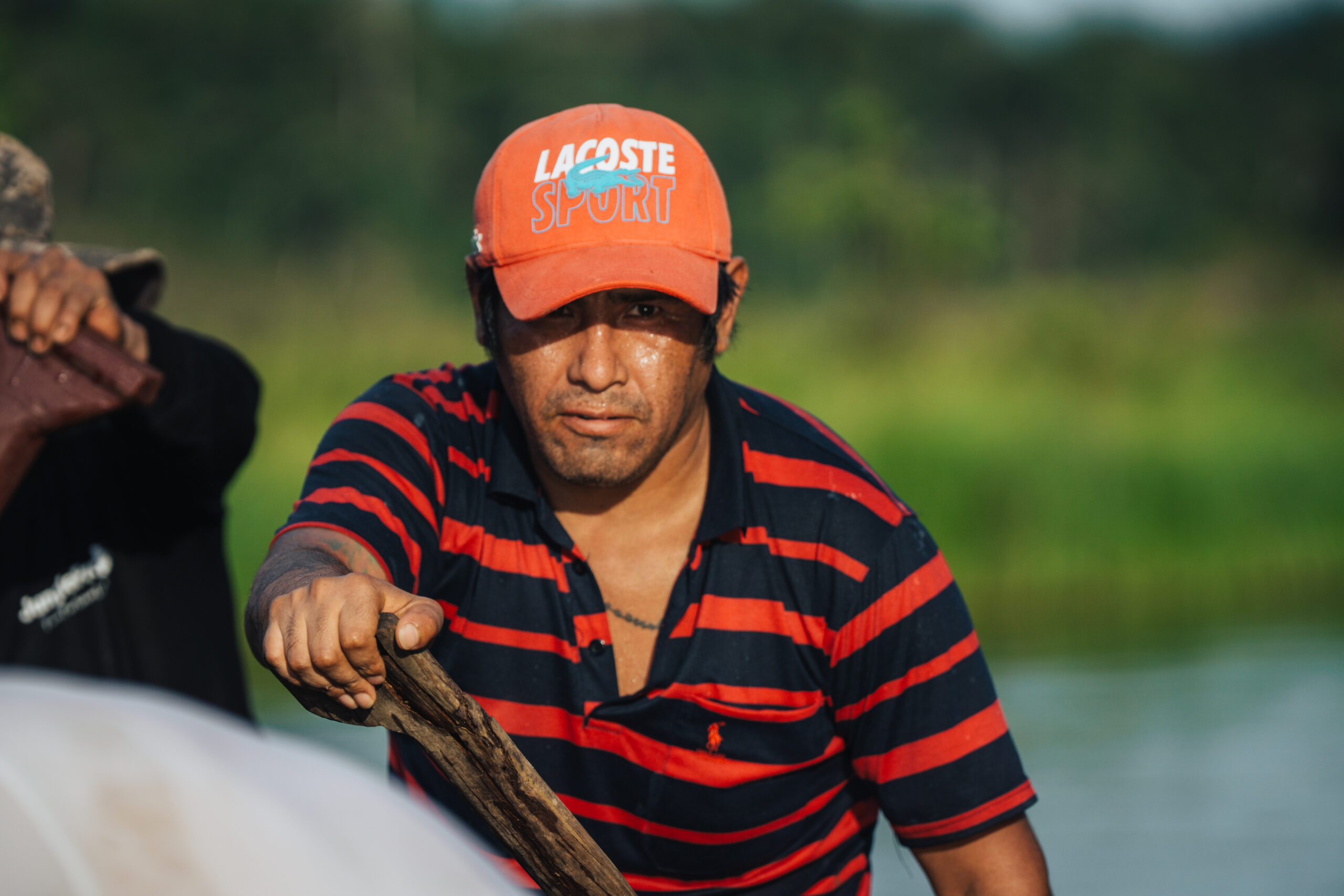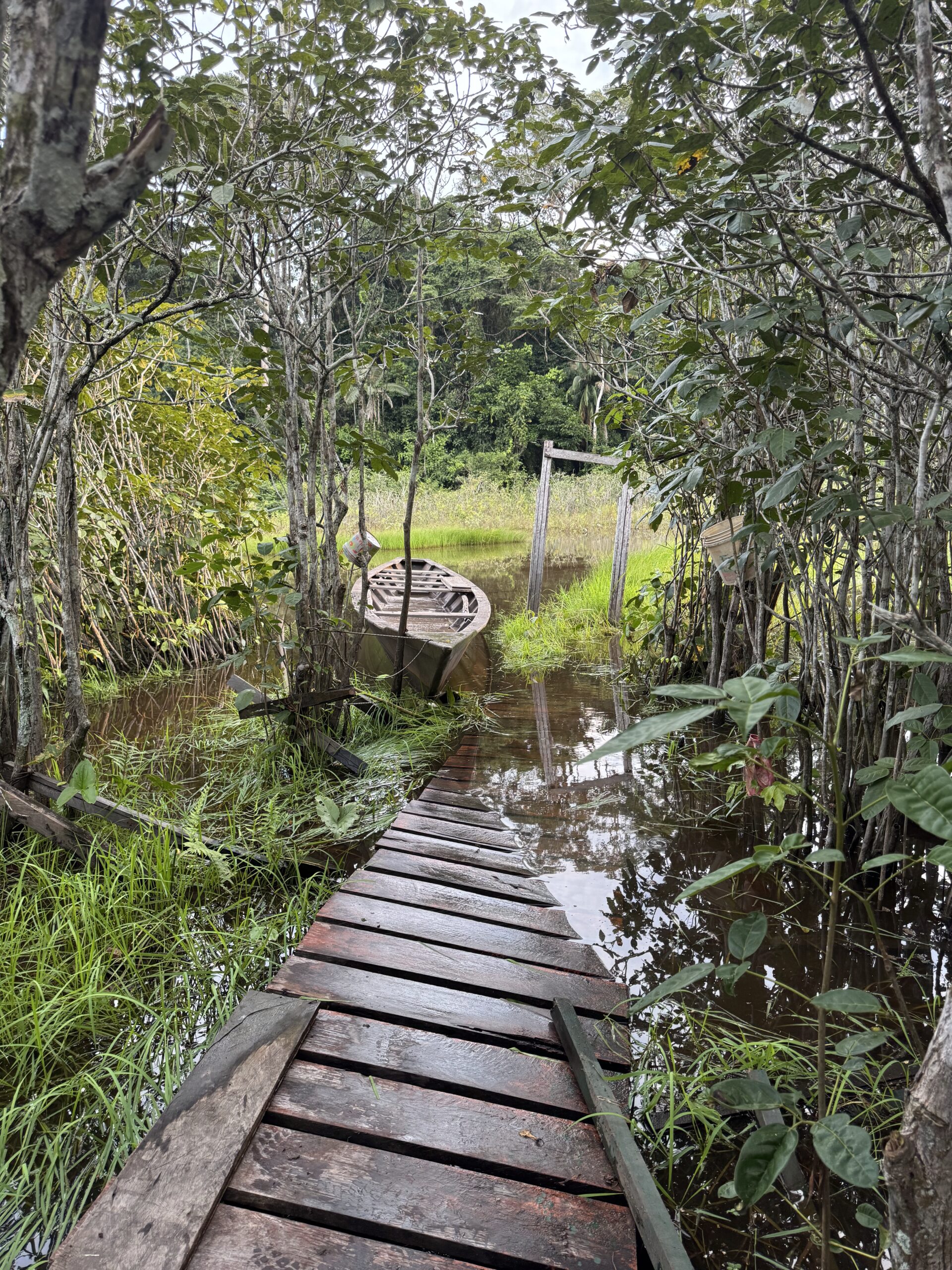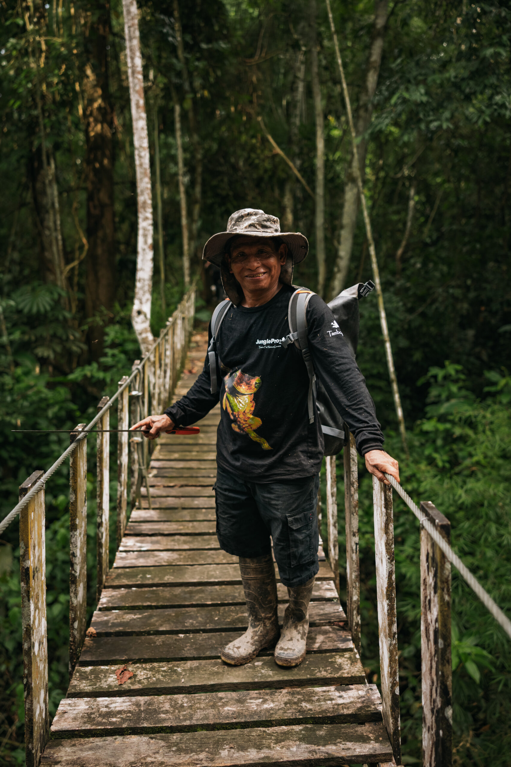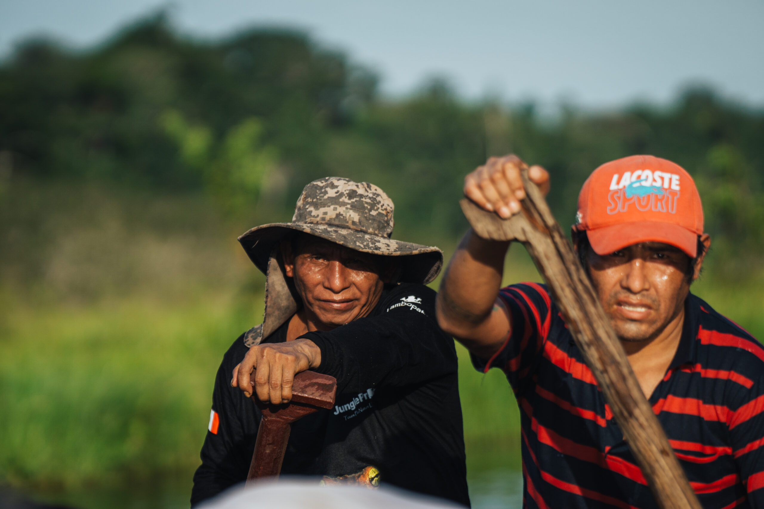 Nakon ručka okupljamo se u predvorju i tu upoznajem dva lokalca koji bi nam trebali pomoći stići do najudaljenijeg jezera. Osigurao ih je Oscar i kao što smo unaprijed dogovorili, sa sobom donose dva dugačka bambusova štapa radi lakšeg nošenja. Po informacijama koje sam dobio o terenu, moja pretpostavka bila je da će me tako biti najlakše nositi. Ovaj treking nam je zapravo predstavljao najveći izazov i bio je jedina stvar koja je radi svoje težine i udaljenosti bila pod najvećim upitnikom od svega u Amazoni.