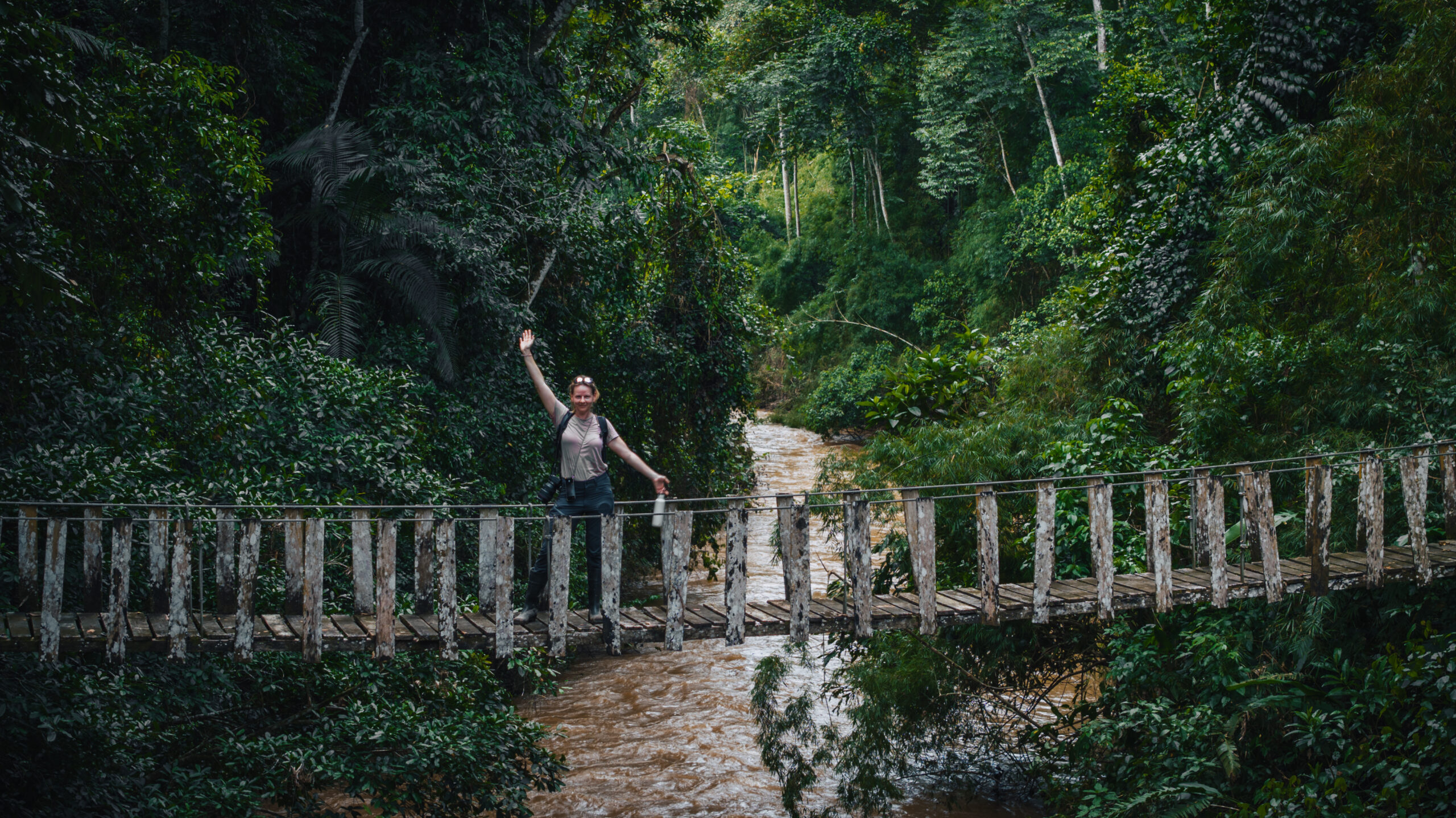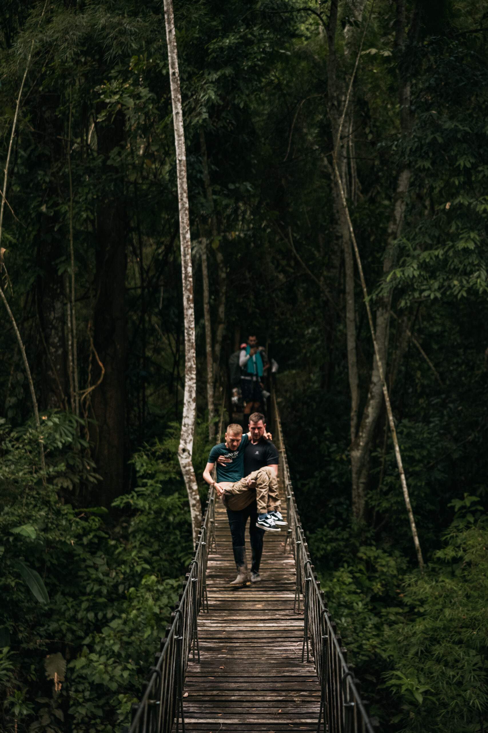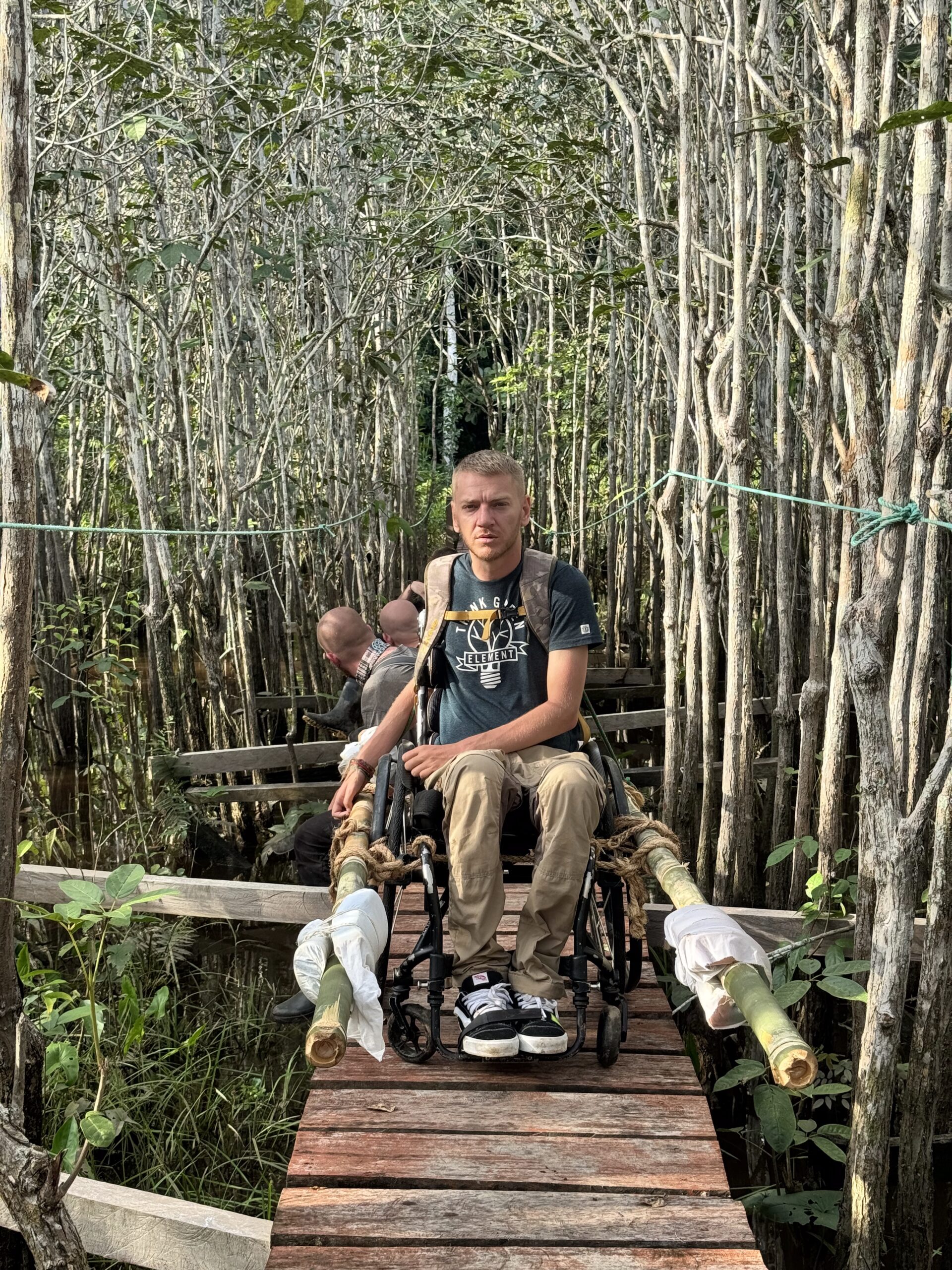 Iako nisam očekivao neka veća iznenađenja, na prvo nailazimo nakon puna dva sata hoda. Ispred nas se u jednom trenutku stvara niti manje niti više nego viseći most! Iako sam viseći most već jednom prelazio na Sumatri, taj je za razliku od ovog već na prvu djelovao sigurnije, barem vizualno. Ovo što ja upravo gledam ispred sebe je most više nalik onom iz filma Indiana Jones. Osim toga, prelaziti viseći most pješke i u kolicima dva su potpuno različita iskustva. Kako mi je povrijeđen taj centar za balans, ili kako se već zove, prelazeći ovakav most u kolicima teško je potpuno dočarati. Najbliže bi bilo opisati ga kao stanje potpune pijanosti uz koje ti još netko miče „tlo“ pod nogama…