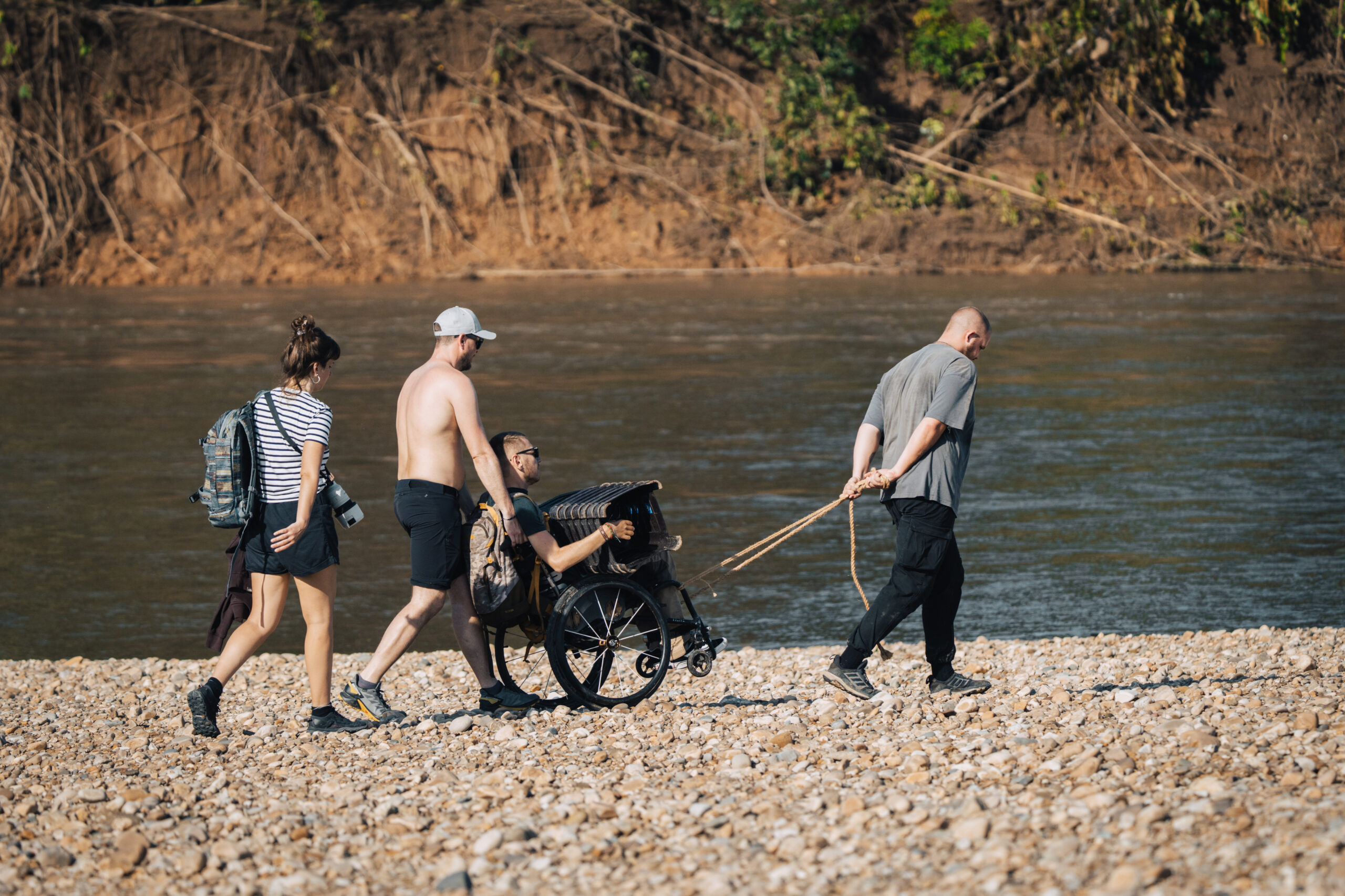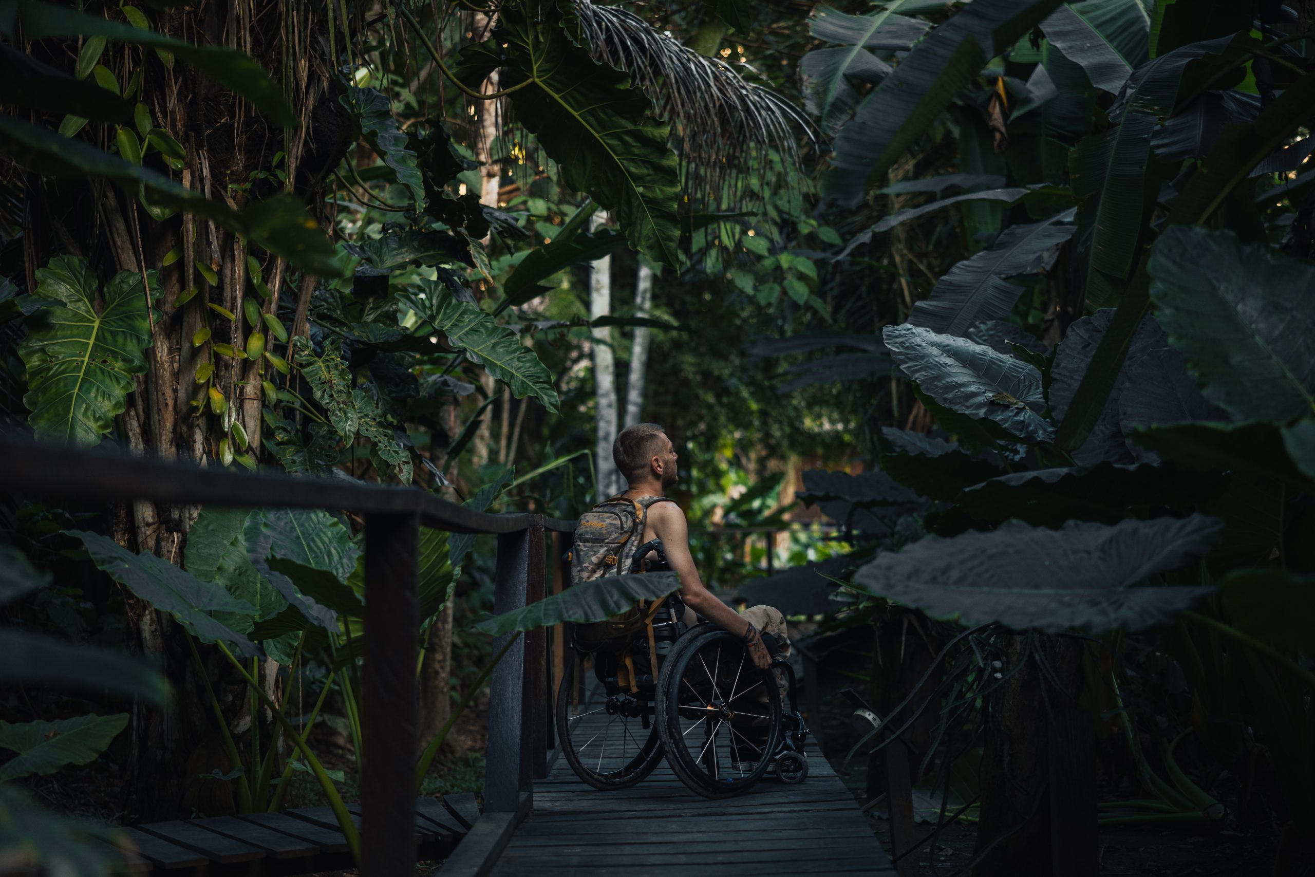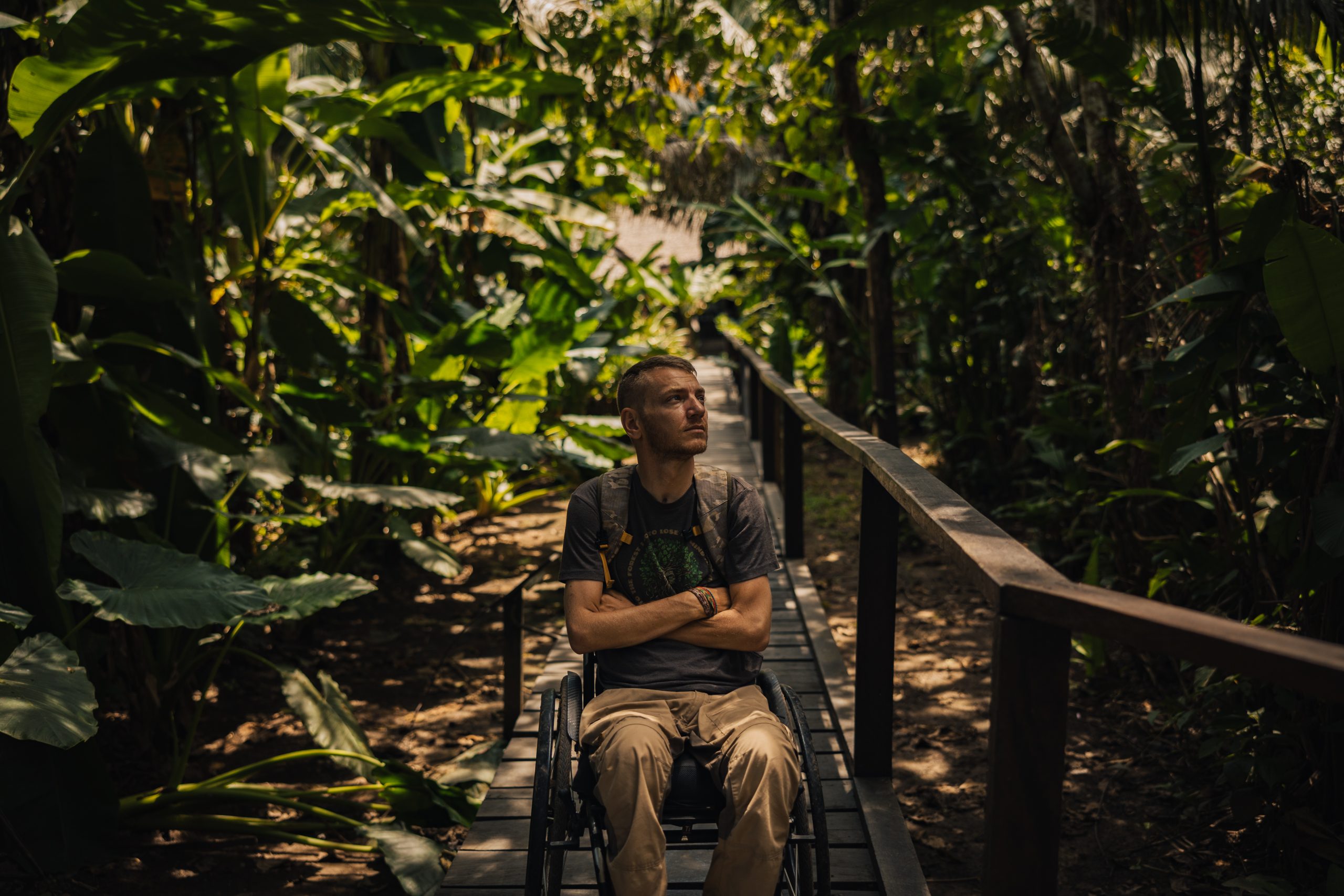 Iako nisam očekivao neka veća iznenađenja, na prvo nailazimo nakon puna dva sata hoda. Ispred nas se u jednom trenutku stvara niti manje niti više nego viseći most! Iako sam viseći most već jednom prelazio na Sumatri, taj je za razliku od ovog već na prvu djelovao sigurnije, barem vizualno. Ovo što ja upravo gledam ispred sebe je most više nalik onom iz filma Indiana Jones. Osim toga, prelaziti viseći most pješke i u kolicima dva su potpuno različita iskustva. Kako mi je povrijeđen taj centar za balans, ili kako se već zove, prelazeći ovakav most u kolicima teško je potpuno dočarati. Najbliže bi bilo opisati ga kao stanje potpune pijanosti uz koje ti još netko miče „tlo“ pod nogama…