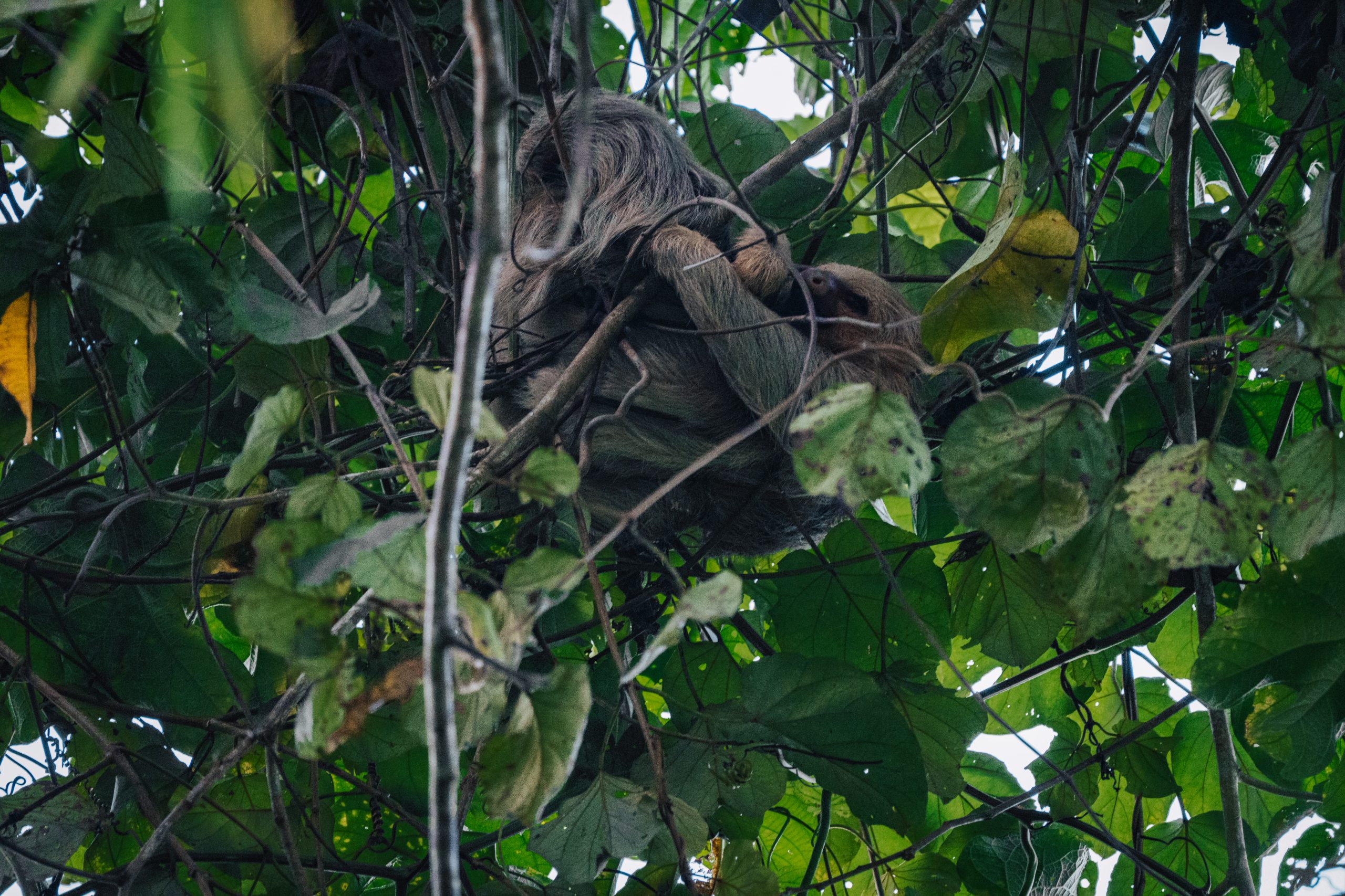 Stigavši do obale, u procesu prebacivanja mene i stvari sa splavi, ostajemo bez jedne pirane. Pada nam nazad u jezero! I što sad!? Gledamo tu jedinu preostalu malu piranu i razmišljamo kako je uopće podijeliti na sedam dijelova? Ništa, puštamo i tu te odlazimo praznih ruku. Ovaj nam je dan očito sretan pa nakon što nas pred stepenicama smještaja pozdravlja naš kajman prijatelj, popevši se gore, Yuri u krošnji drveta uočava ljenjivca! Visoko je, spava, apsolutno ga boli briga za nas i mi tu ne možemo baš ništa pa ga ostavljamo u miru…