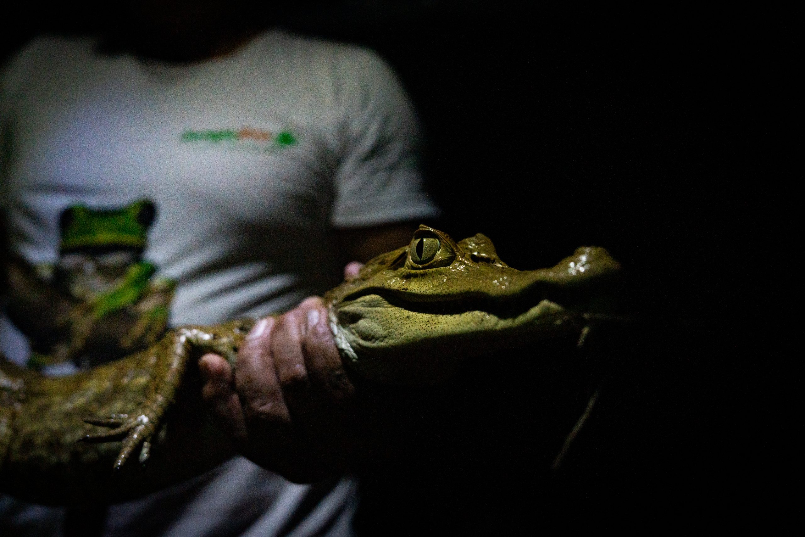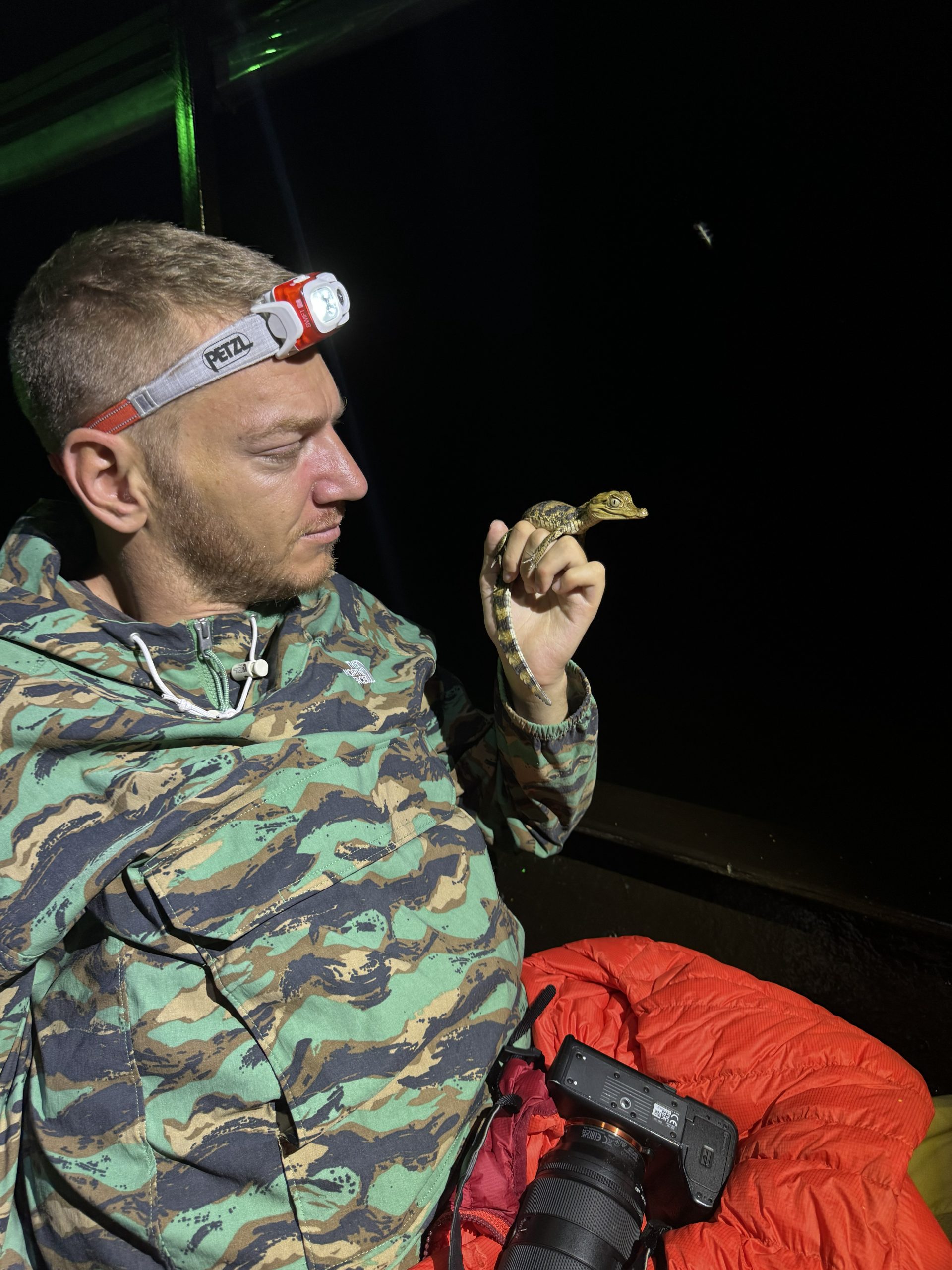 Plovimo sporo uz obalu, a jedino osvijetljene predstavlja nam Yuri na pramcu broda i njegova lampa. On i kapetan broda jako su dobro usklađeni, ali ono meni još fascinantnije je koliko su Yurieva osjetila izoštrena. Sve vidi i sve čuje! Tako u jednom trenutku usporavamo, zavladava potpuna tišina, Yuri gura ruku duboko u rijeku i van izvlači kajmana dužine od oko jednog metra!